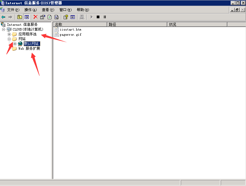 6.打開IIS管理會(huì)看到對應(yīng)的網(wǎng)站管理選項(xiàng):“應(yīng)用程序池”、“網(wǎng)站”、“Web 服務(wù)擴(kuò)展”。