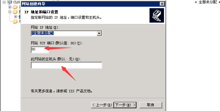 9.第二項(xiàng):設(shè)置網(wǎng)站的IP地址(可以不分配),設(shè)置網(wǎng)站端口(默認(rèn)端口是80,可以通過IP直接訪問。其他端口可以使用“IP:端口號(hào)”的格式訪問。如:192.168.1.1.:8080),設(shè)置此網(wǎng)站的主機(jī)頭(此項(xiàng)可以不填寫,也可以填寫網(wǎng)站的域名。不填寫可以在搭建完畢后設(shè)置需要綁定的域名。如果填寫域名,只填寫一個(gè)域名即可,如:“ceshi.com”或“www.ceshi.com”)。