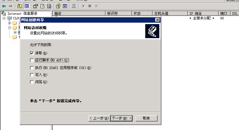 11.設(shè)置網(wǎng)站訪問權(quán)限:勾選所需要的權(quán)限(一般只需要勾選前三項(xiàng),“讀取”、“運(yùn)行腳本”、“執(zhí)行”。